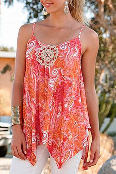 Яркая тонкая туника на тонких лямках кораллового цвета с подолом выполненным углами.
