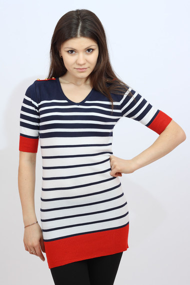 Удлиненный джемпер-туника в разноцветную полоску с рукавами чуть выше локтя. Украшен небольшими погонами на плечах и крупными золотистыми пуговицами.