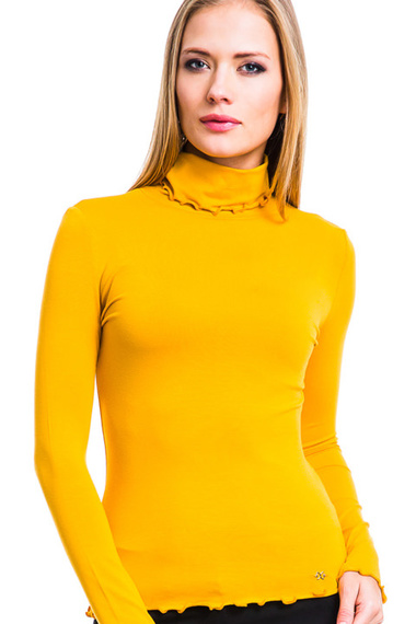Простая водолазка желтого цвета с рюшами на воротнике, рукавах и низу изделия. Универсальный и яркий вариант для серых будней!