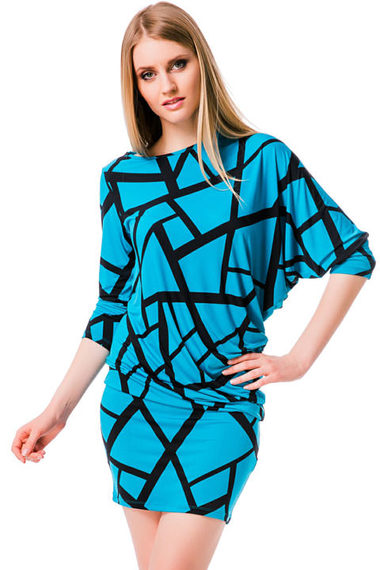 Платье насыщенного бирюзового цвета с геометрическим принтом покорит вас своим молодежным покроем: один рукав данного изделия выполнен в форме крыла летучей мыши.